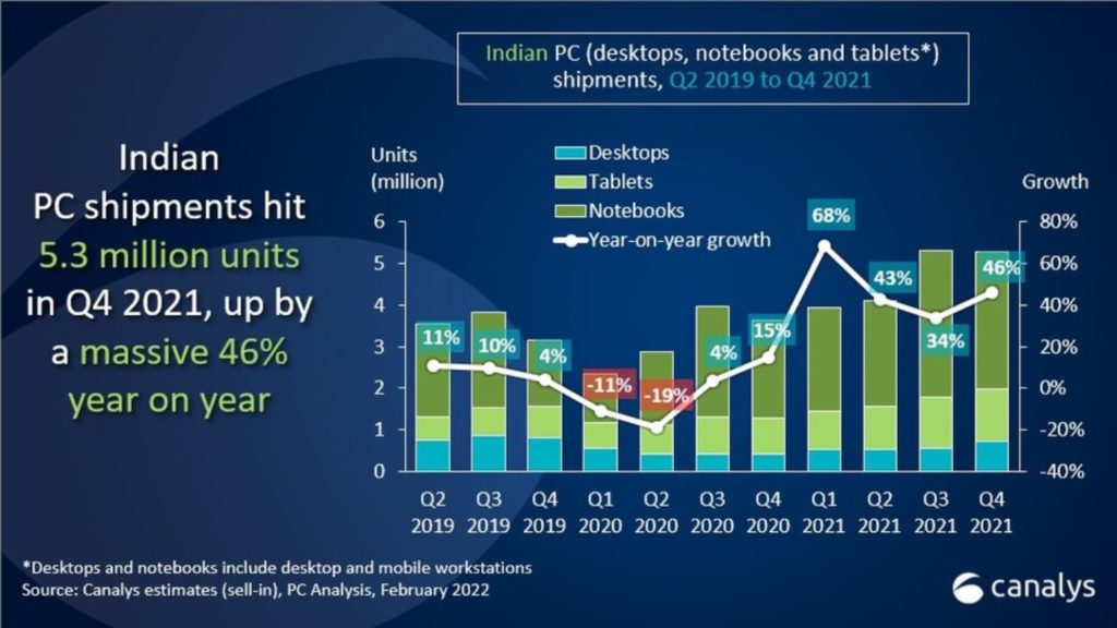 Canalys says 2021 was the best year for India since 2013, when shipments grew by 29%. The research group adds that this is a notable achievement, considering most of India was under lockdown in the first and second quarters when the second wave of the COVID-19 pandemic was at its peak.