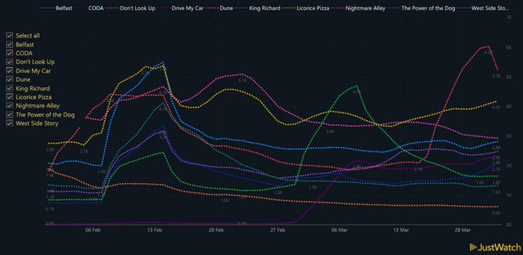 You can check out JustWatch’s interactive tracker here: Best Picture Popularity Tracker.