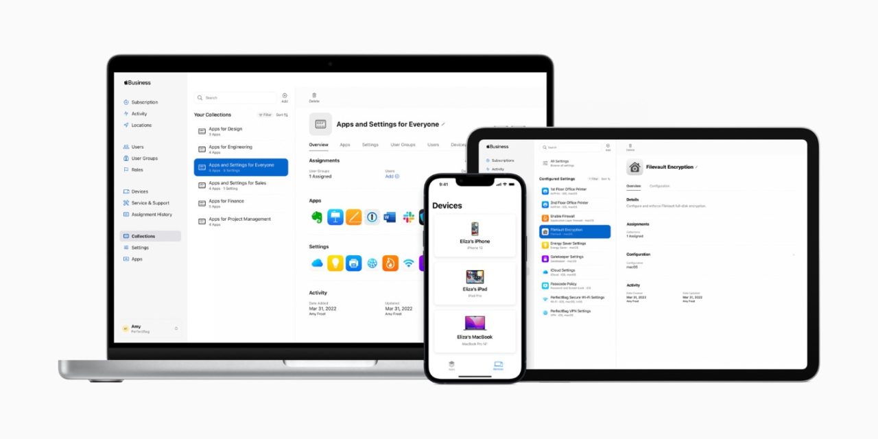 The complete solution begins with simple employee onboarding, allowing a small business to configure, deploy, and manage Apple products from anywhere. With the Collections feature, groups of apps can be delivered to employees or teams, and settings can be automatically pushed to devices, such as VPN configurations, Wi-Fi passwords, and more.