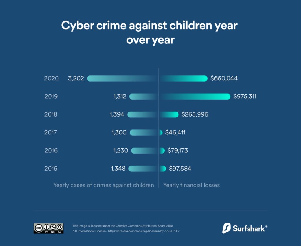 He adds that the number of cybercrimes against children steadily grew each year by 5–9% but sharply spiked by 144% in 2020, after roughly 1 billion school children worldwide were relocated online for remote learning. In 2020 alone, yearly financial losses from cybercrimes against children reached US$ 660,000 (which is, thankfully, a year-over-year decrease of32%).