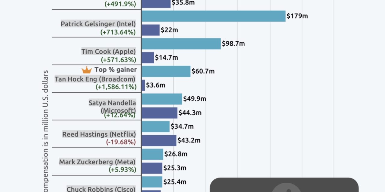 Intel’s CEO ranks third with gains of 713.64% from $22 million to $179 million, followed by Apple’s Tim Cook, who recorded a bonus surge of 571.63% from $14.7 million to $98.7 million. Amazon’s Andy Jassy caps the top five category with gains of 491.9%, from $35.8 million to $211.9 million.