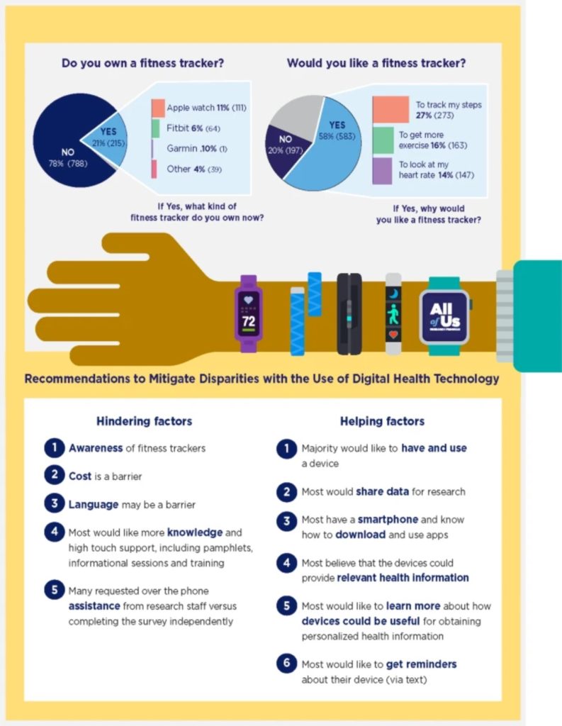 Barriers included cost and lack of information, revealing that broad digital health device adoption requires education, investment, and high-touch methods. Conversely, the study showed that there was high interest in having a device and learning about how fitness trackers can be used to track health, a willingness to share data for research, owning a smartphone and knowledge of how to download and use apps, and an interest in learning more.