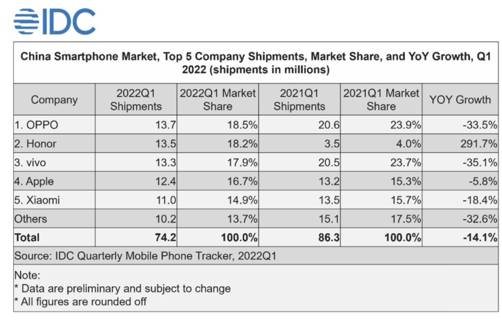 According to the IDC Worldwide Quarterly Mobile Phone Tracker, 74.2 million smartphones shipped in China in the quarter, down 14.1% year-on-year. The research group says the decline was not only the result of a high comparison base year but also due to a continued soft demand caused by the lack of product upgrades and the surge of the COVID-19 cases.