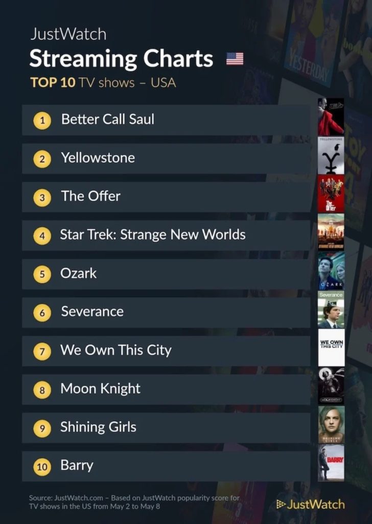 The former was in sixth place on the list; the latter in ninth place. Also, in the top 10, in descending order, are “Better Call Saul,” “Yellowstone,” “The Offer,” “Star Trek: Strange New Worlds,” “Ozark,” “We Own This City,” “Moon Knight,” and “Barry.”