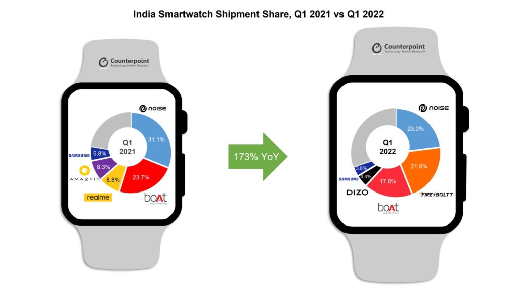“The top three brands captured 60% share in Q1 2022,” says Research Analyst Harshit Rastogi. “Noise led the overall smartwatch market driven by its value-for-money offerings, the addition of relevant features to its product portfolio and emphasis on the Make-in-India scheme. Fire-Boltt emerged as the second-largest player for the first time due to its focus on affordability and the introduction of feature-packed products.”