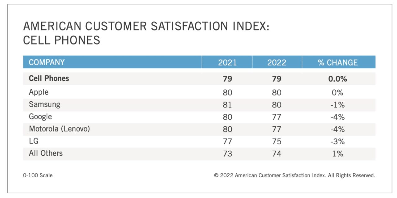Google and Lenovo’s Motorola both plunge 4% to 77, ahead of LG, which tumbles 3% to an ACSI score of 75. Despite improving 1%, the group of smaller companies is last at 74.