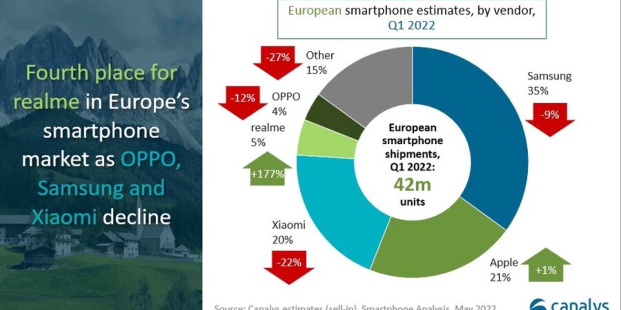 European smartphone shipments fell 10% year on year in quarter one of 2022, coming in at 41.7 million units, according to Canalys. However, Apple’s iPhone sale inched up 1% during the period, notes the research group.