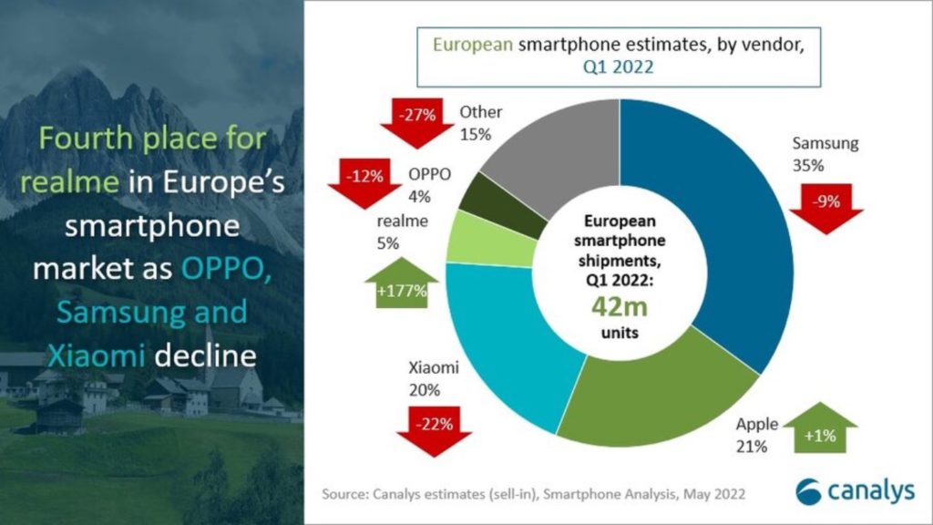 “Most of the decline in Europe was due to Russia and Ukraine being hit hard. Shipments in the countries fell 31% and 51% respectively compared with Q1 2021,” says Canalys Research Analyst Runar Bjørhovde. “Shipments in the rest of Europe only declined 3.5% year on year, showing that demand remains intact. But the ongoing war has driven inflation to a record level and consumer confidence is falling. The real test for the smartphone market will come in the next two quarters, when the economic impact of the war truly starts to be felt.”
