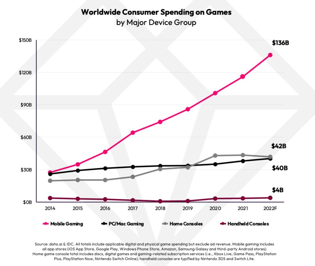 The report says that in 2022 mobile gaming will surpass 60% market share in annual global consumer spend — 3.2x the size of the next largest form factor: Home Console Gaming