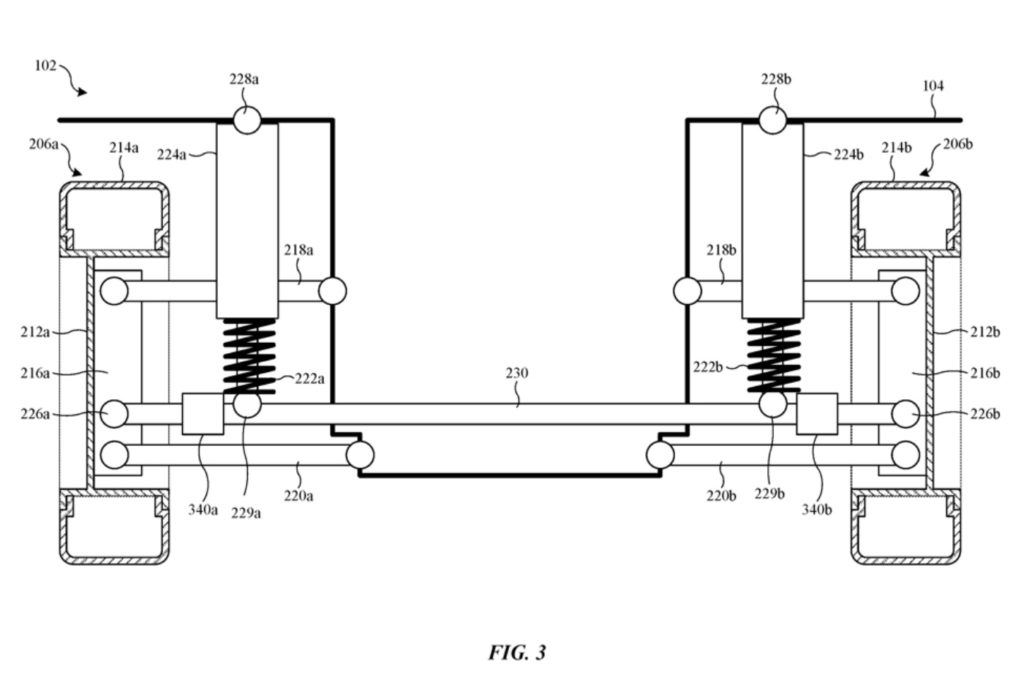 Here’s Apple’s abstract of the patent: “A suspension system for a vehicle that has a vehicle body, a first wheel assembly that includes a first wheel hub, and a second wheel assembly that includes a second wheel hub. The suspension system includes a crossbar that is pivotally connected to the first wheel hub of the first wheel assembly and is pivotally connected to the second wheel hub of the second wheel assembly. The suspension system also includes a first active suspension actuator that is located near the first wheel assembly, is connected to the vehicle body, is connected to the crossbar, and supports the vehicle body with respect to the crossbar.