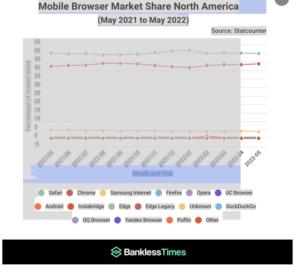 Apple’s Safari browser has more than 1 billion users globally, according to a May 31 report from atlasVPN. Now, according to BanklessTimes’ analysis, Safari commands the North American mobile browser market with a market share of 50%. Its closest challenger Google Chrome on its part holds 43.91% of the same market.