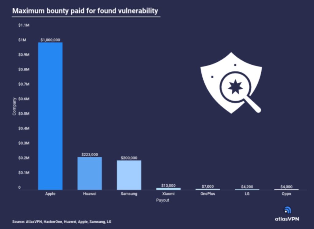 According to data compiled by the Atlas VPN team, Apple pays five times more for exposing a vulnerability than Samsung. Exploits that allow hackers to perform network attacks without user interaction are usually worth the most in bug bounty.