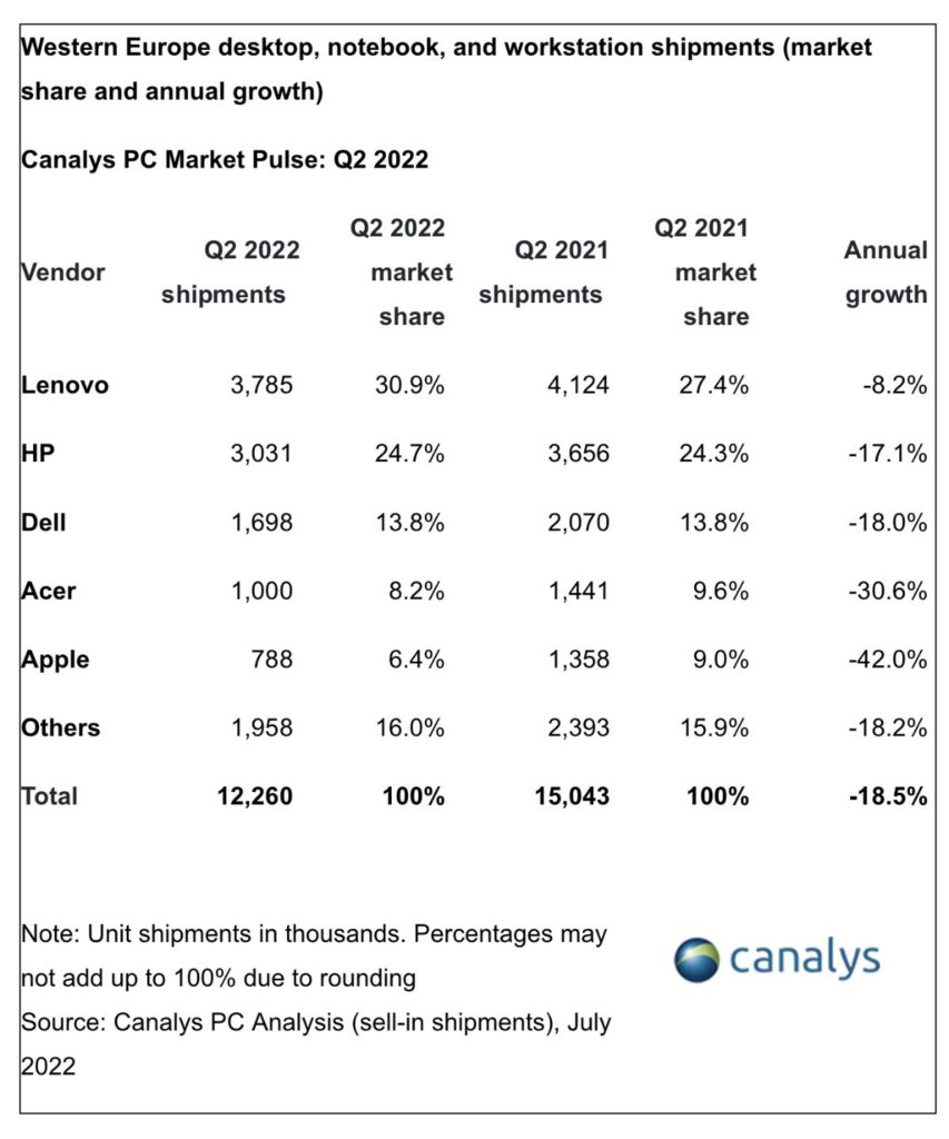 Lenovo remained Western Europe’s top choice for desktops and notebooks. Though its shipments fell 8% to 3.8 million units in Q2 2022, it was the best performing vendor in the top five and made a market share gain of more than three percentage points compared with a year ago.