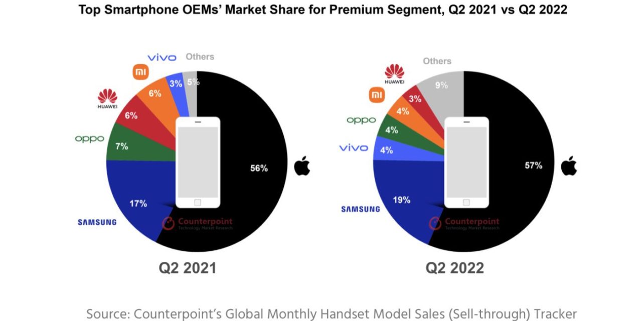 The global premium smartphone market (US$400 and above wholesale price) average selling price (ASP) grew 8% year-over-year (YoY) to reach $780, a second-quarter record, in quarter two (Q2) of 2022, according to Counterpoint Research.