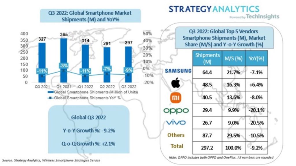 According to new research from Strategy Analytics, global smartphone shipments fell -9% year-over-year (YoY) to 297 million units in quarter three (Q3) 2022. Apple ranked in second place with 16% share, the highest third quarter performance over the past 12 years