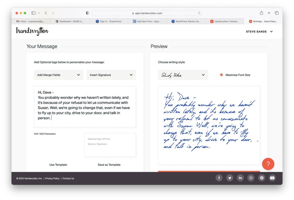 I like Handwrytten so much that I’ve started using it to send birthday cards to relatives and friends. It’s a lot easier than buying a card, writing something by hand, getting a stamp, taking the card to the mailbox, etc…