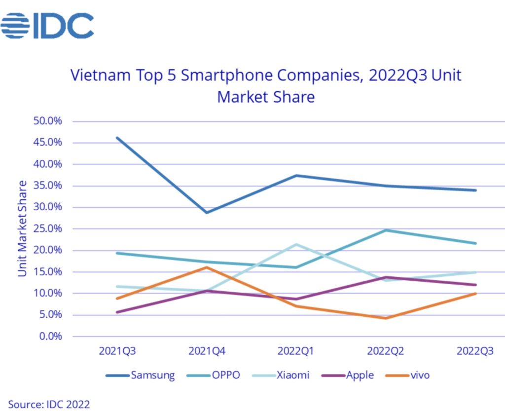 The research groups says the QoQ drop was a result of channel partners clearing inventory and preparing for the launch of the iPhone 14 series in October. Apple’s support for its local partners by adjusting distribution and pricing policies has helped grow local shipments and reduce the number of hand-carried iPhones from overseas, according to IDC. Apple is fourth among smartphone companies in Vietnam, based on market share.