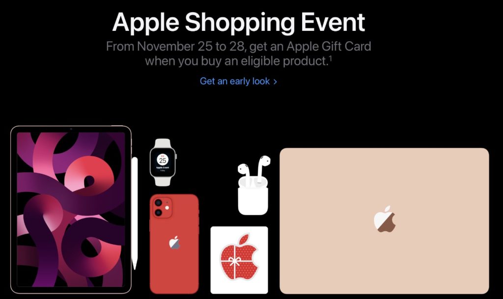 Apple will hold a special “Apple Shopping Event” between Black Friday (November 25) and Cyber Monday (November 28) where customers will be eligible to get a gift card when they purchase eligible products.