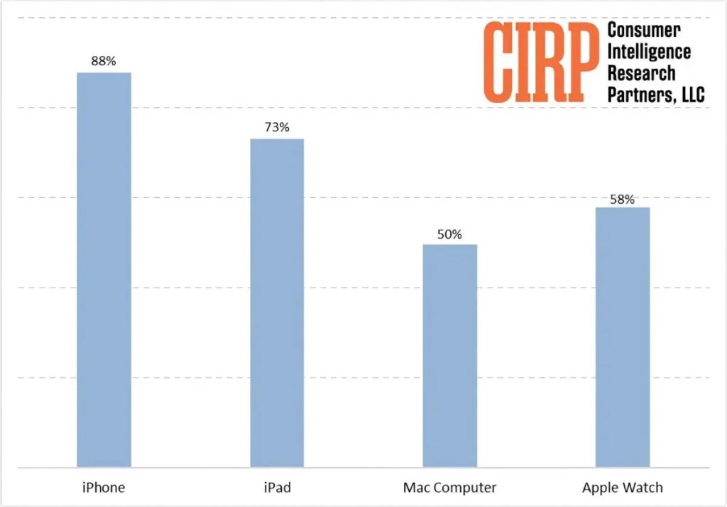 Not surprisingly, iPhone is the dominant product, according to CIRP. Almost 90% of Apple customers own an iPhone, with a customer defined as someone who purchased any of those four products in the quarter of the survey.