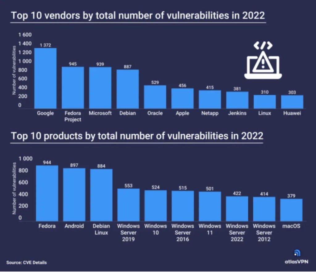 According to new data presented by the Atlas VPN team, Google, Fedora Project, and Microsoft products had the most vulnerabilities in 2022.