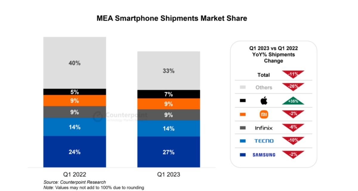 Smartphone shipments in the Middle East and Africa (MEA) region fell 11% year-over-year (YoY) and 3% quarter-over-quarter (QoQ) in the first quarter (Q1) of 2023 to reach the lowest Q1 shipment level since 2016, according to the latest research from Counterpoint Research.