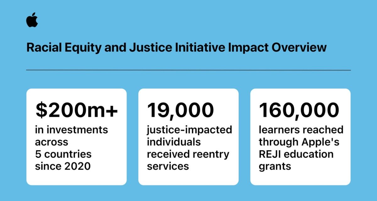 Apple has announced its Racial Equity and Justice Initiative (REJI), a long-term global effort to advance equity and expand opportunities for Black, Hispanic/Latinx, and Indigenous communities, has more than doubled its initial financial commitment to total more than $200 million over the last three years.