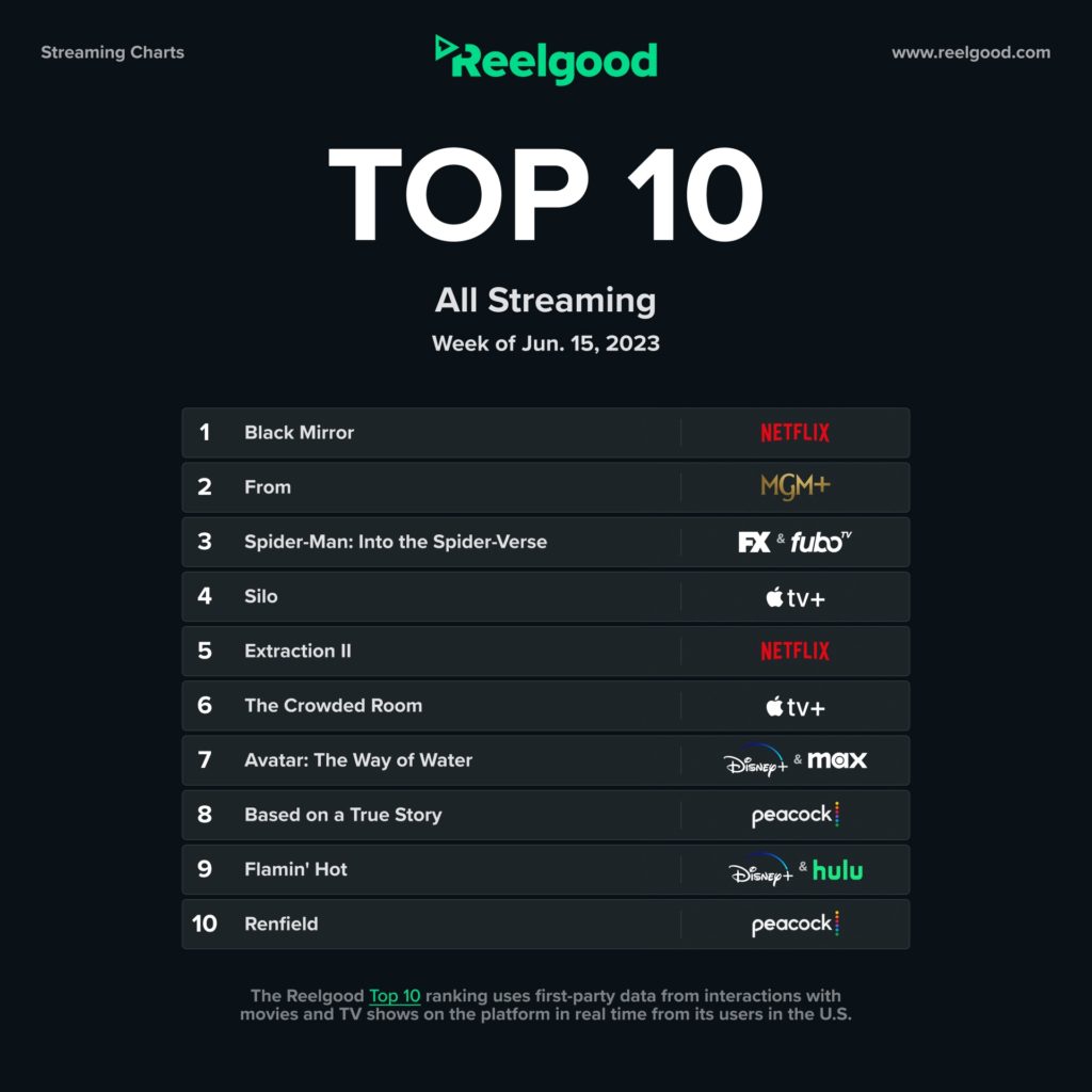 Apple TV+ and Peacock are going strong as well, with Silo at number four and The Crowded Room at number six. Peacock’s Based on a True Story and Reinfield come in at numbers eight 10, respectively.