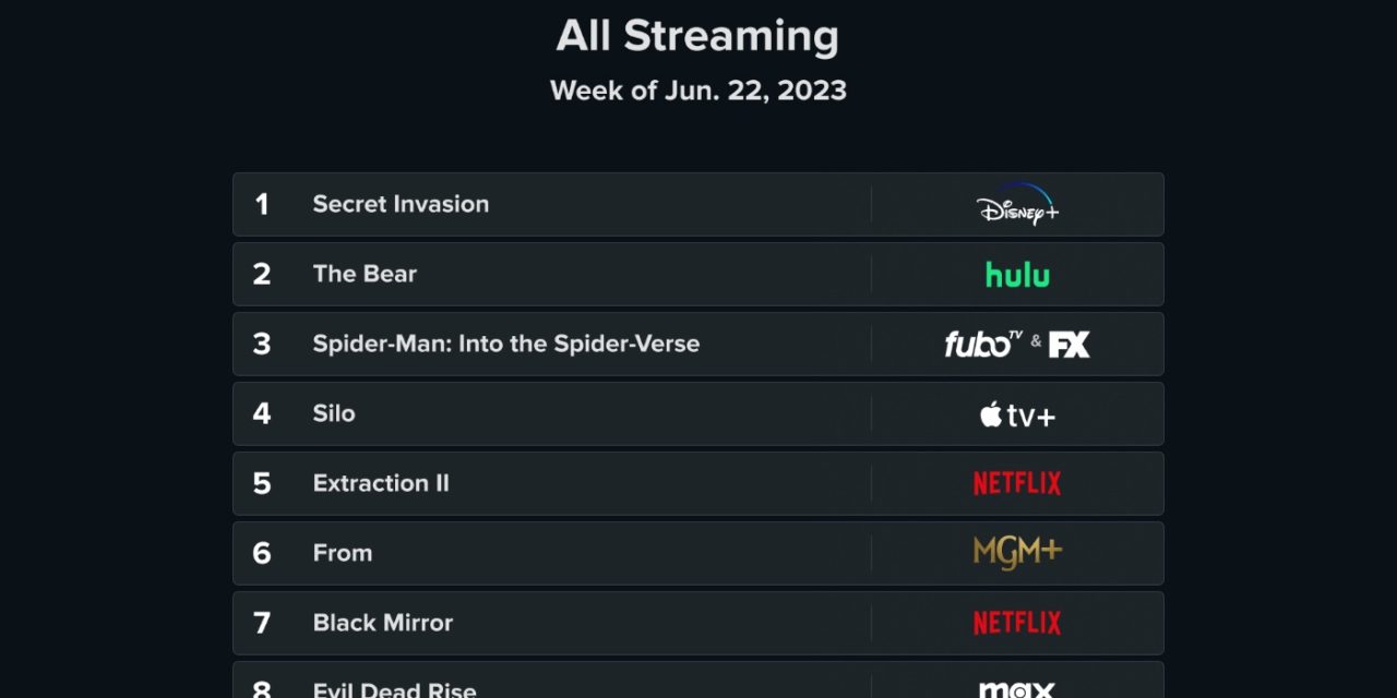 Disney+ is back on Reelgood’s Top 10 list of the most popular streaming shows/movies this week with Secret Invasion. Hulu’s hit The Bear takes spot #2. And Apple TV+’s Silo is still in the top 10, dropping from first place last week to fourth place this week.