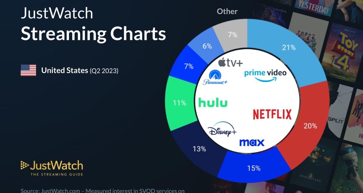 Prime Video continues to hold down the streaming crown in the U.S. with a 1% lead over global giant, Netflix. They have 21% and 20% market share, respectively. The newly rebranded Max (formerly HBO Max) has 15% market share. Disney+ has 13%. Hulu has 11% and Paramount has 7%.