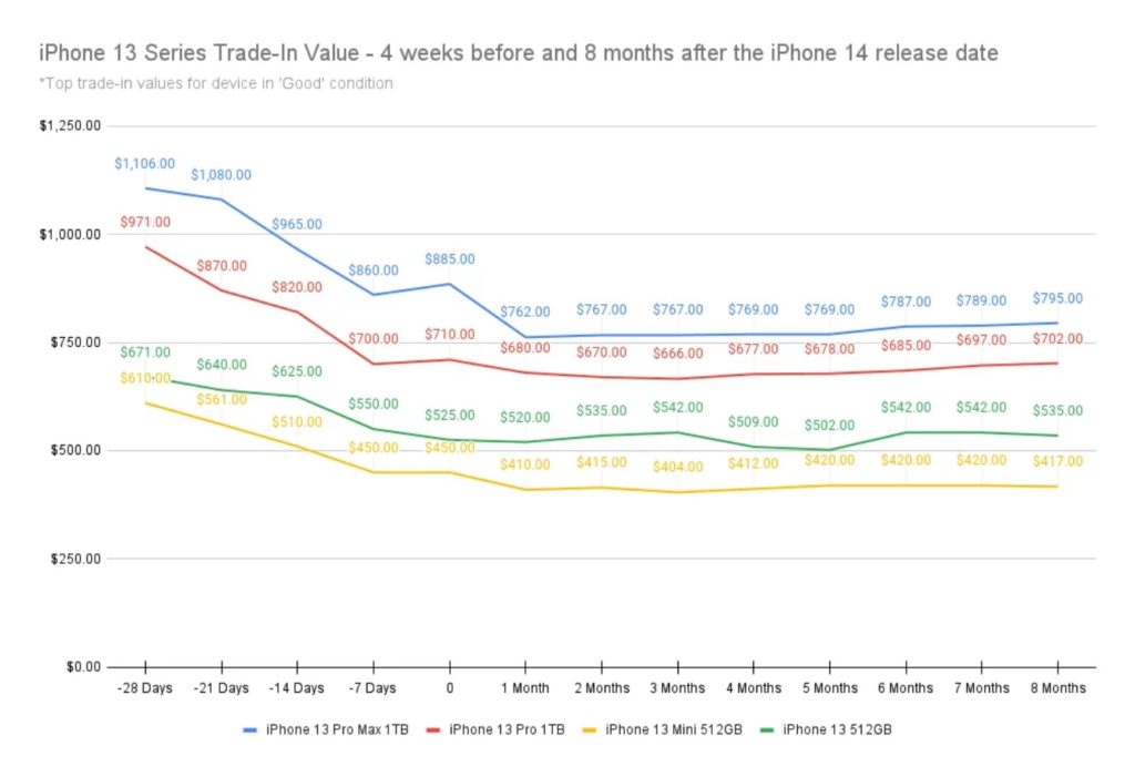 ° Between August 19 and September 16, 2022, Apple’s 2021 flagship—the iPhone 13 Pro Max 1TB—went from a value of $1,106.00 to $885.00. In four weeks, it lost a massive $221 in value.