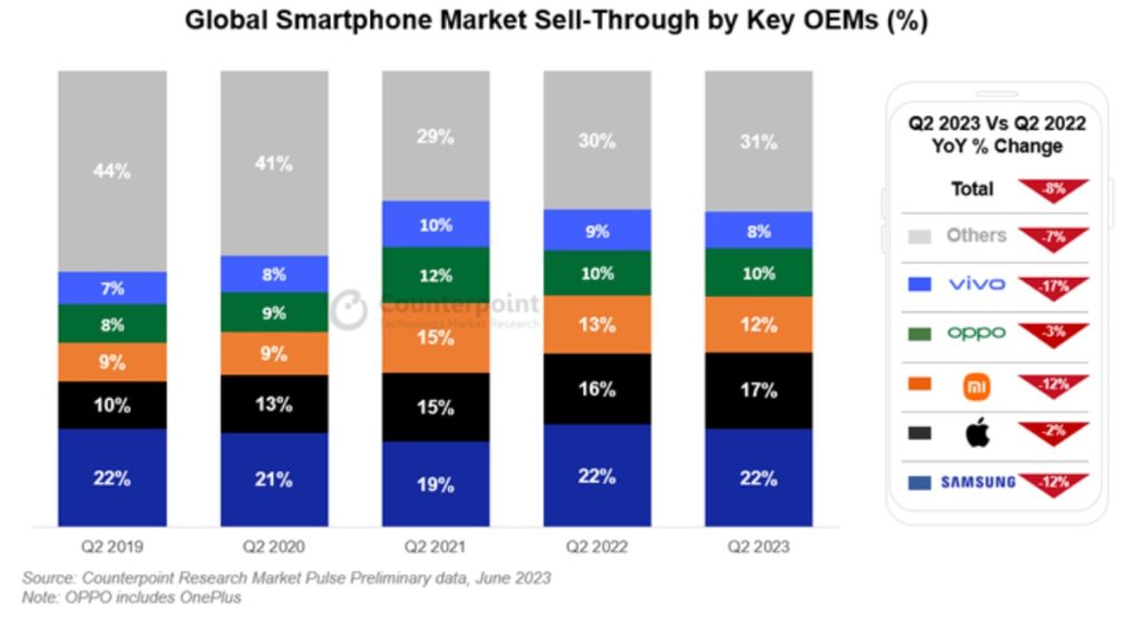 The global smartphone market’s sell-through declined 8% year-over-year and 5% quarter-over-quarter in the second quarter of 2023, according to the latest research from Counterpoint’s Market Pulse service. This was the eighth consecutive quarter to see a year-over-year decline, notes the research group.
