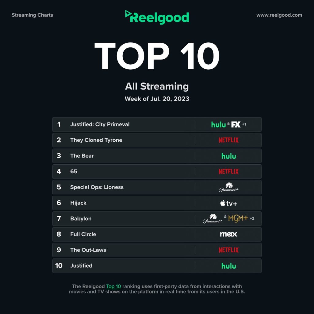 Justified: City Primeval is the most popular title in this week’s Reelgood Top 10 list of streaming programs. Joining the list as well are Special Ops: Lioness (fifth place) and Babylon (seventh place)