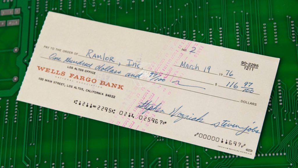 Among them: an Apple Computer check “No. 2” signed by co-founders Steve Jobs and Steve Wozniak. The historic check, dated March 19, 1976, was issued to a printed circuit board company, marking one of Apple’s earliest payments during its inception. The check predates Apple Computer, Inc.’s official founding by 13 days.