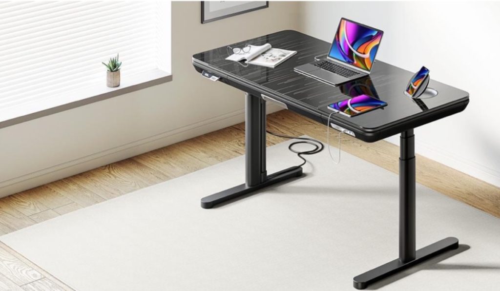 The flagship model of the ErgoFx features a black glass tabletop with a stylistic pattern. The desk is also available with a wood grain finish, in jet black, and walnut brown.