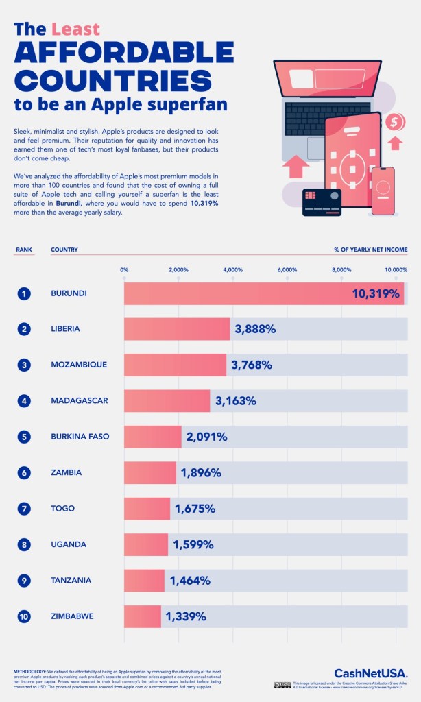 - Burundi is the least affordable country for Apple products, with the superfan suite costing 10,319% (more than 100x) of the average annual income.