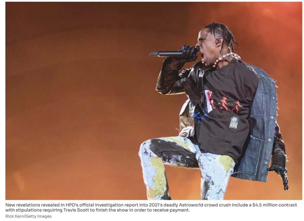 A new report released by the Houston Police Department details its investigation into the deadly 2021 Astroworld crowd crush revealed a host of details about the night that left 10 concertgoers dead and hundreds injured—including revelations of a multimillion-dollar agreement between headliner Travis Scott and Apple contingent on the show’s completion, according to The Chron.