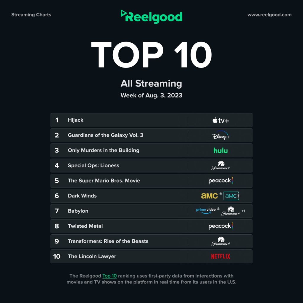 Also in the to 10 are Guardians of the Galaxy Vol. 3 (second place), Special Ops: Lioness (fourth), Dark Winds (sixth), Babylon (seventh), Twisted Metal (eighth), Transformers: Rise of the Beasts (ninth), and The Lincoln Lawyer (10th).