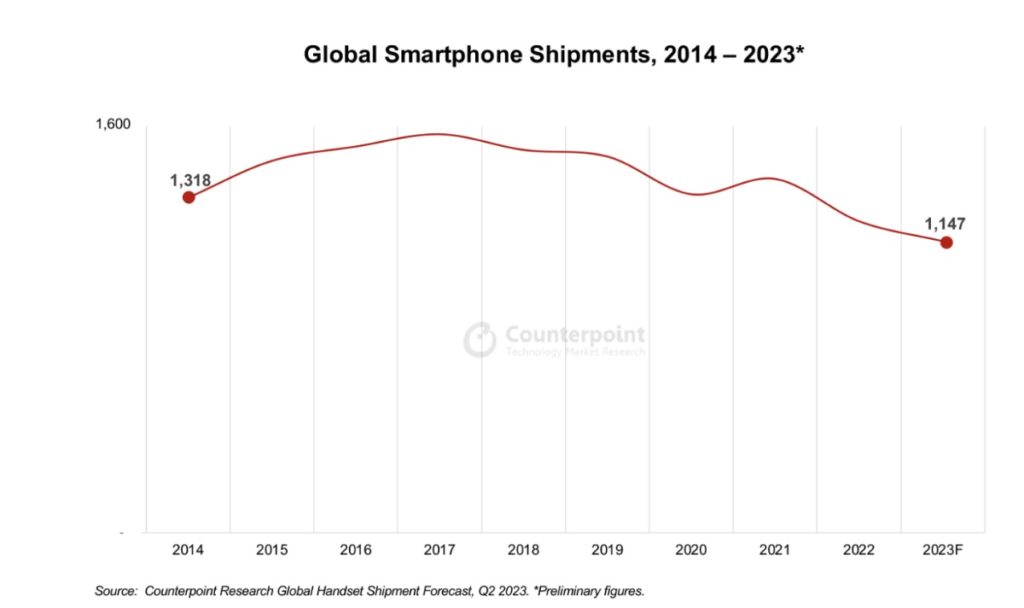 According to preliminary figures from Counterpoint Research’s latest “Global Smartphone Shipment Forecast,” 2023 shipments are forecast to decline 6% to 1.15 billion units, the lowest in a decade.