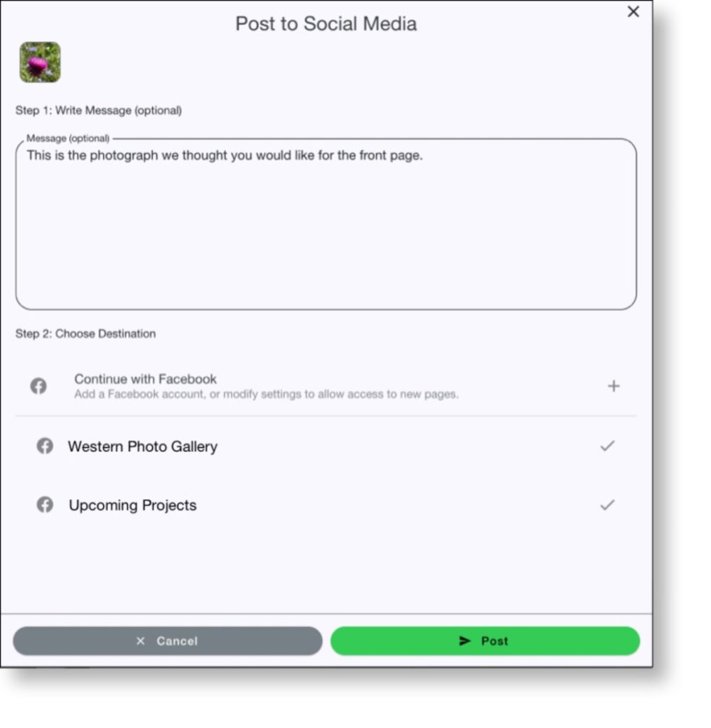 With FileShadow, users share images directly to Facebook from the FileShadow app. FileShadow also allows users to post content through the Website Collection Manager. Website Collections can be shared with anyone, regardless of where they are located or using FileShadow. Anyone inside or outside the FileShadow system can contribute files to Website Collections.