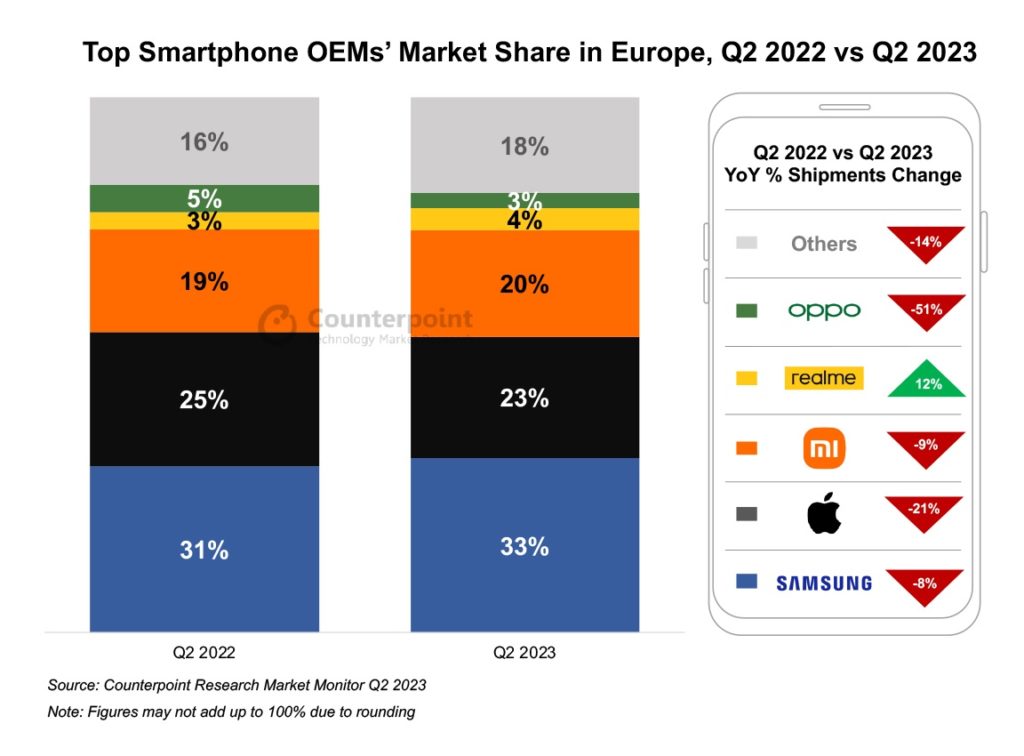 Western Europe smartphone shipments declined by 14% year-over-year during the quarter while Eastern Europe limited its fall to 8% year-over-year despite being in an already battered state, says Counterpoint. All major European nations performed weakly in the second quarter of 2023, except Russia, which conversely registered 4% year-over-year growth. However, Counterpoint ays this was primarily due to lower shipments in the second quarter of 2022 – the first full quarter after Russia’s invasion of Ukraine and the resulting sanctions and market exits of prominent smartphone players.