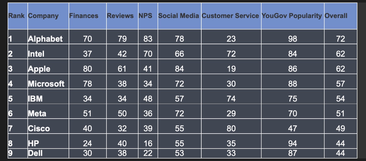 Apple ranks third, just behind Intel, after scoring 61.8. The tech giant has the best financial and social media score, the second-best average review rating, and the fourth-best customer NPS. Apple has the highest social media engagement of 0.3% and the most YouTube, TikTok, and Instagram followers. Its YouGov popularity rating ranks fifth. Surprisingly, Apple scored lowest for customer service, with over 1.2 million monthly searches for customer service and support.