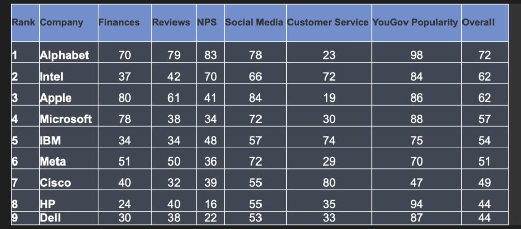Apple ranks third, just behind Intel, after scoring 61.8. The tech giant has the best financial and social media score, the second-best average review rating, and the fourth-best customer NPS. Apple has the highest social media engagement of 0.3% and the most YouTube, TikTok, and Instagram followers. Its YouGov popularity rating ranks fifth. Surprisingly, Apple scored lowest for customer service, with over 1.2 million monthly searches for customer service and support.