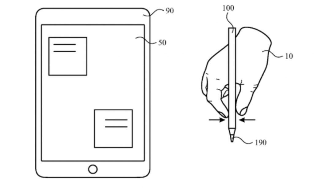 Apple says the additional input provided by detecting squeezing or compressive force can allow the stylus to provide improved usability and on screen/off screen interaction with the electronic device. For example, the squeezing input can provide context sensitive actions, program switching, tool switching, confirmation of actions, etc. The user can squeeze or compress the stylus at a natural grip position or other positions to provide different inputs to the electronic device.