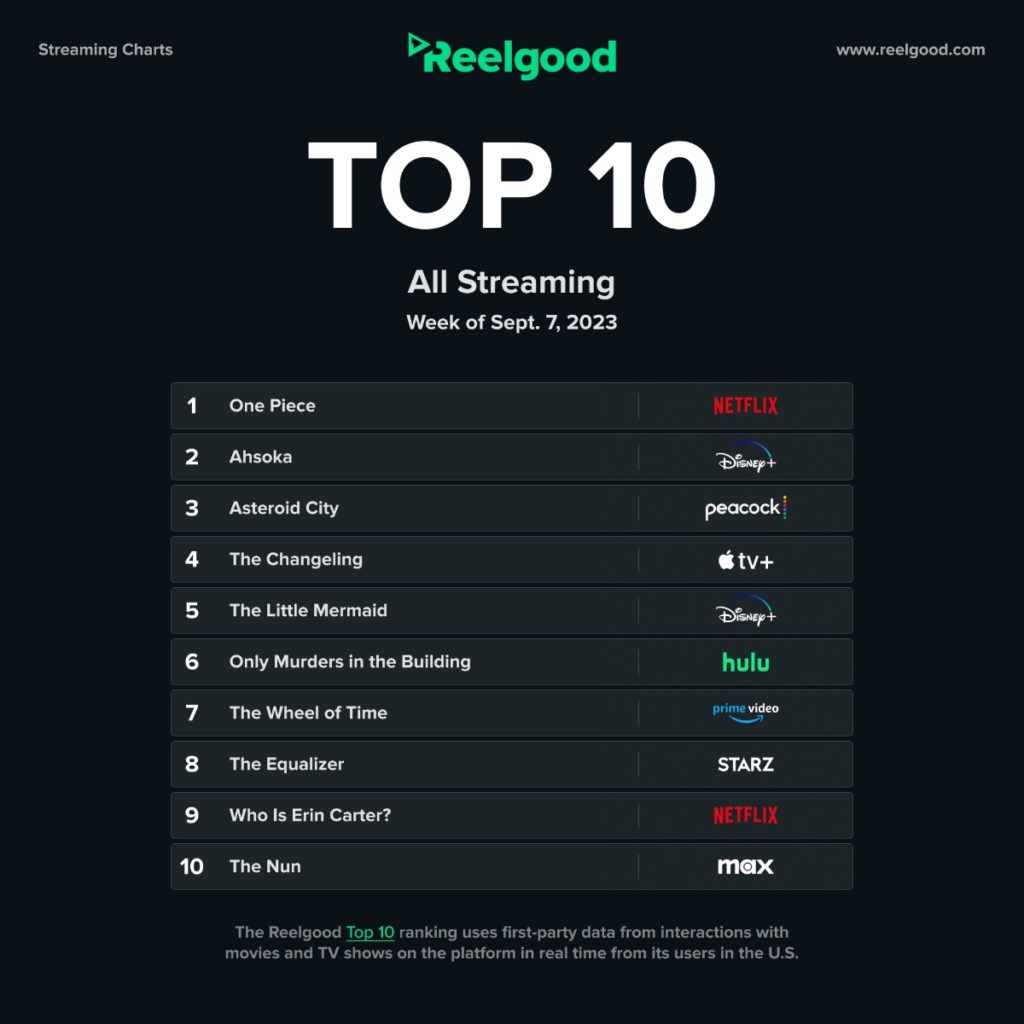 The top 10 list includes, in descending order, “One Piece,” “Ashoka,” “Asteroid City,” “The Changeling,” “The Little Mermaid,” “Only Murders in the Building,” “The Wheel of Time,” “The Equalizer,” “Who is Erin Carter,” and “The Nun.”
