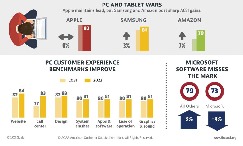 Customer satisfaction with personal computers – including desktops, laptops, and tablets – is stable at 79 (out of 100), according to the American Customer Satisfaction Index (ACSI) Household Appliance and Electronics Study 2021-2022.