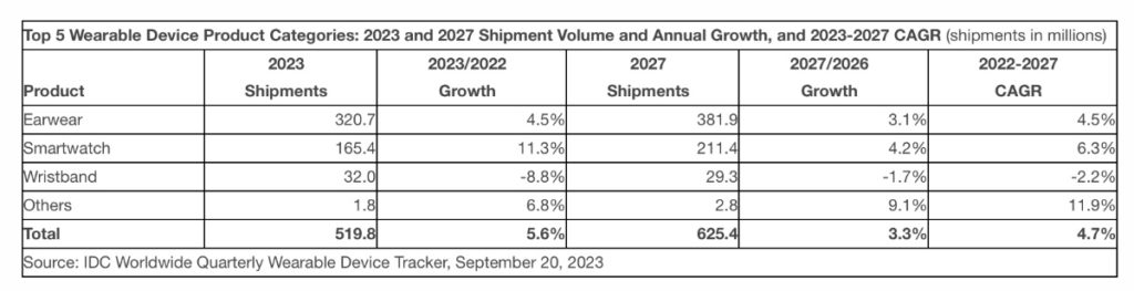 With growth returning this quarter, IDC forecasts 520 million wearables will be shipped in 2023, up 5.6% from 2022. Hearables will be the top category with nearly 62% of the wearables shipped this year, followed by smartwatches with nearly 32% of shipments. Looking ahead, the market is expected to grow to 625.4 million by the end of 2027, representing a 4.7% compound annual growth rate (CAGR).