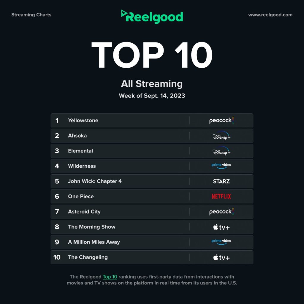 The top 10 list includes, in descending order, “Yellowstone,” “Ahsoka,” Elemental,” “Wilderness,” “John Wick Chapter 4,” “One Piece,” “Asteroid City,” “The Morning Show,” “A Million Miles Away,” and “The Changeling.”