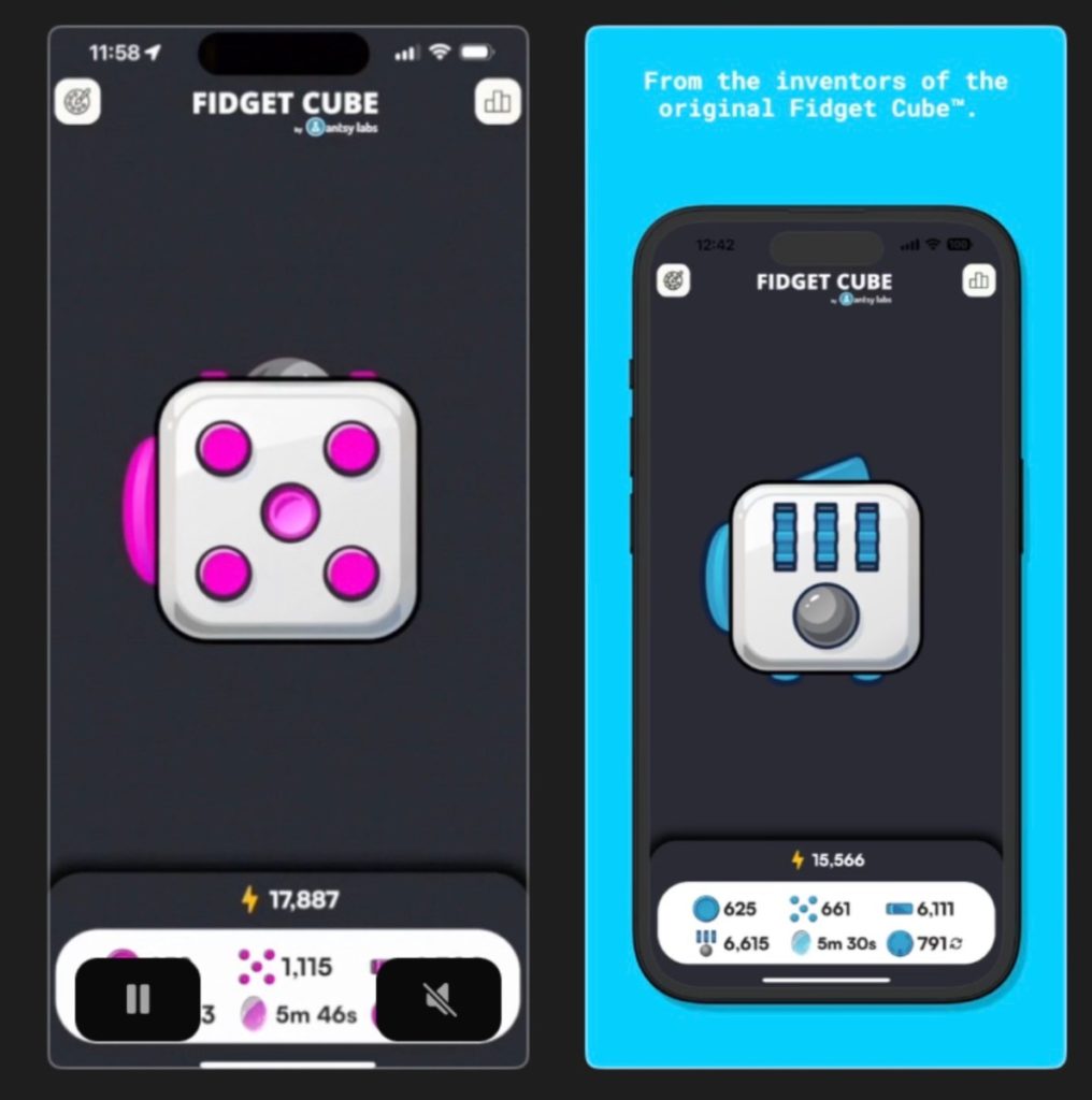 Here’s how it’s described: Click it, spin it, flip it – all on your iPhone or – drumroll, please – your Apple Watch! Whether you’re in line for coffee or waiting for that ever-late friend (you know who you are…), give your fingers the fidgety outlet they crave and earn some sweet Fidget Energy while you’re at it!