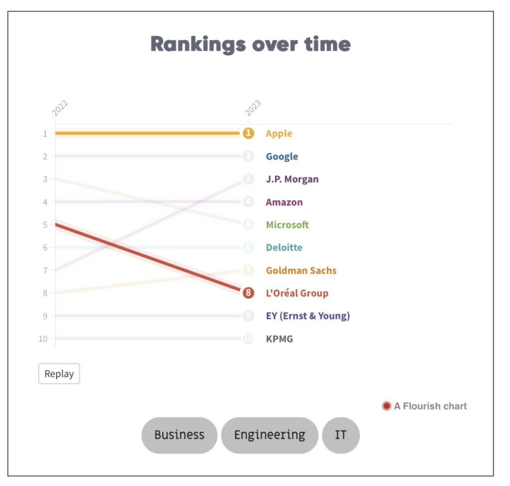 Apple, Deloitte, and L’Oréal Group are three of the most highly attractive companies for business students, Universum’s newly published business-student ranking suggested.