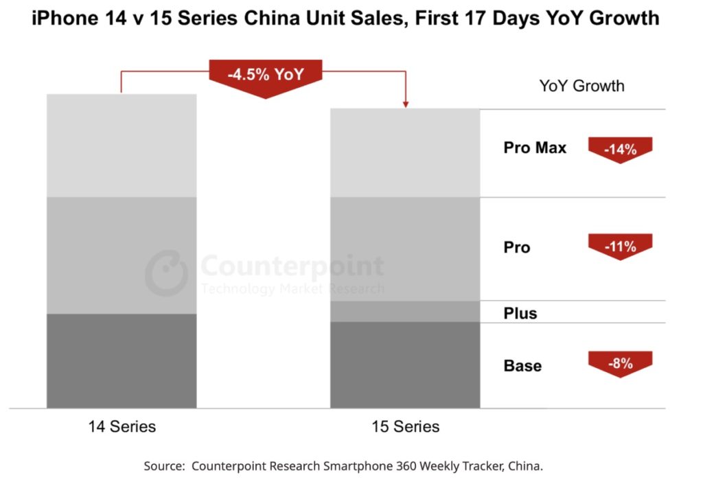 iPhone 15 series unit sales for the first 17 days of sits ales in China underperformed compared to last year’s iPhone 14, according to preliminary data from Counterpoint Research’s Smartphone 360 Weekly Smartphone Sales Tracker.